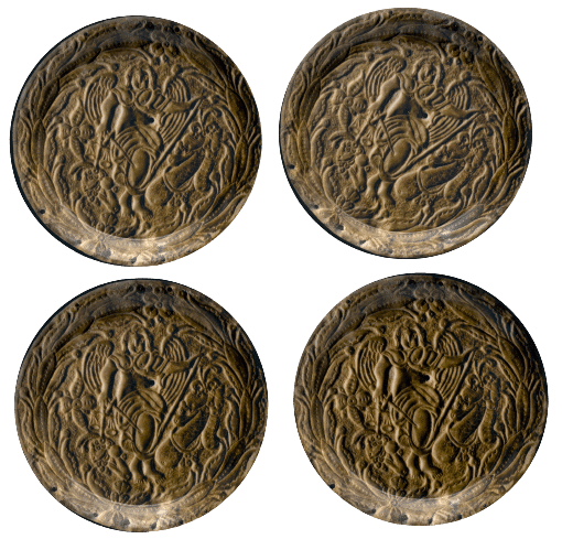 Birch glass mats, four pieces in a package. Picture of a brass sheet of a rock saddle from around 1730.