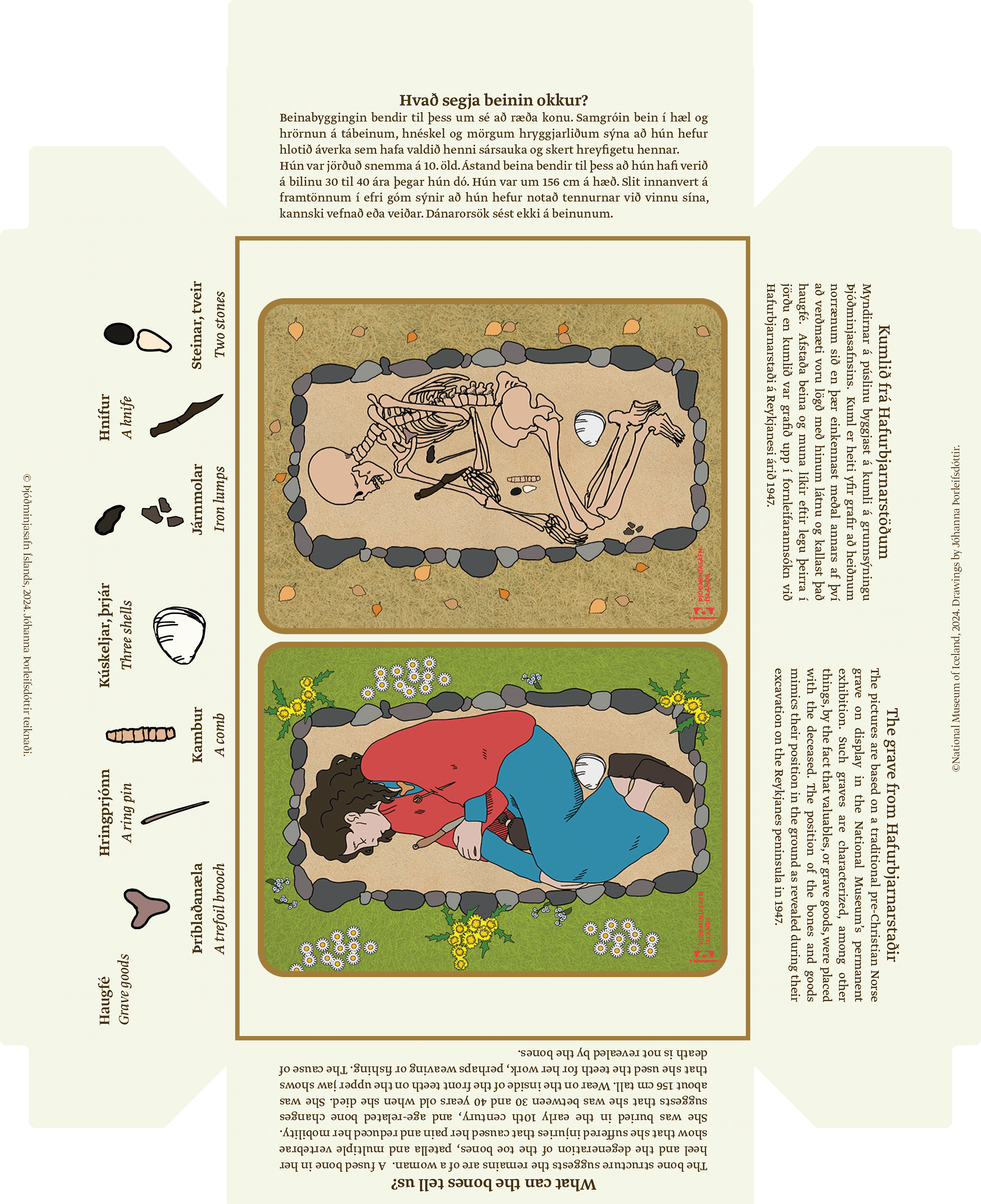 The box includes insightful information derived from the bones of the woman, provided by Joe W. Walser III, a specialist from the National Museum of Iceland's human bone collection. Delve deeper into the story of the grave with details about its significance, along with illustrations of the artifacts discovered within the grave.