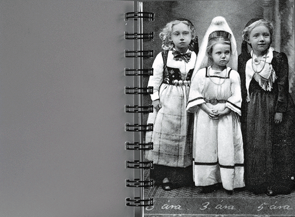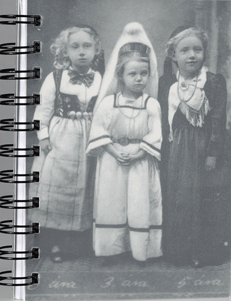 Minnisbók. Stúlkur í íslenskum búningum. Lítil og nett A6 minnisbók, fyrir allt sem þér dettur í hug og vilt ekki gleyma. Myndin á bókinni er af íslenskum stúlkum í íslenskum búningum, upphlut, kyrtilbúningi og peysufötum.