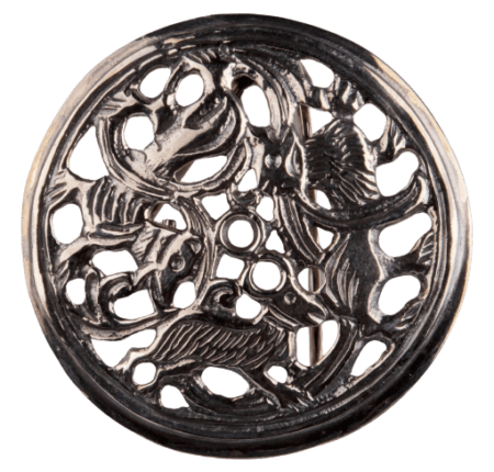 Silfurnæla gerð eftir beltisskildi í rómönskum stíl, sennilega frá 17. öld, en skrautverkið má rekja til miðalda og sýnir þrjú dýr sem elta hvert annað.
