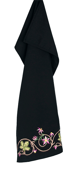 Fallegt mynstur á svörtu bómullarefni, mynstrið er vélsaumað úr gæða bandi. Stærð 40×75 cm.