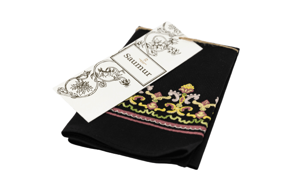 Saumur II – Munnþurrka með blómstursaum. Hér hefur útsaumsmynstur af samfellu í vörslu Þjóðminjasafnsins verið endurgert á munnþurrku (servíettu ) eða diskamottu fyrir fallega skreytt borð.