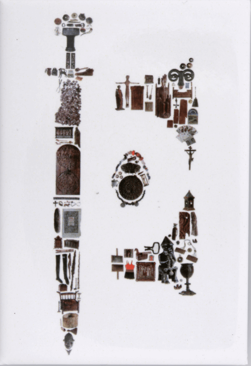 Segull. Þjóð verður til. Ískápssegull með merki Þjóðminjasafnsins, gert úr lykilgripum í tilefni opnunar á grunnsýningunni Þjóð verður til árið 2004.