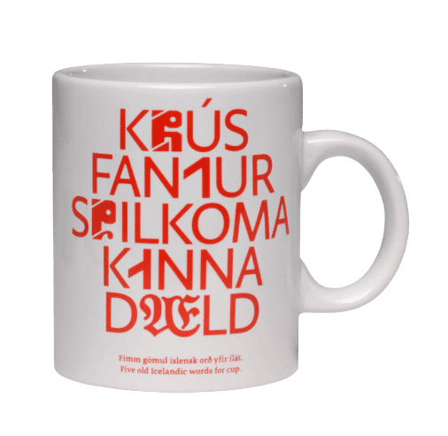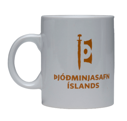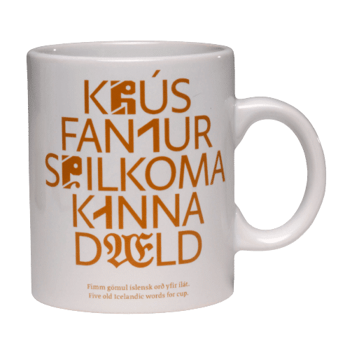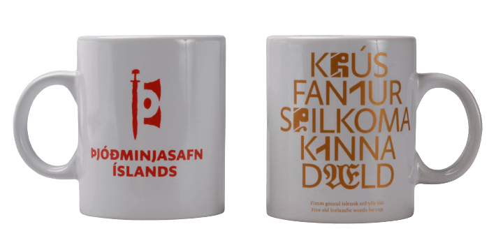Þjóðminjasafns bolli með gömlum orðum, postulínsbolli sem tekur 170 ml af vökva. Bollinn er með áprentuðu merki Þjóðminjasafnsins og gömlum íslenskum orðum um ílát, stafsett með fjölbreyttum stafagerðum.