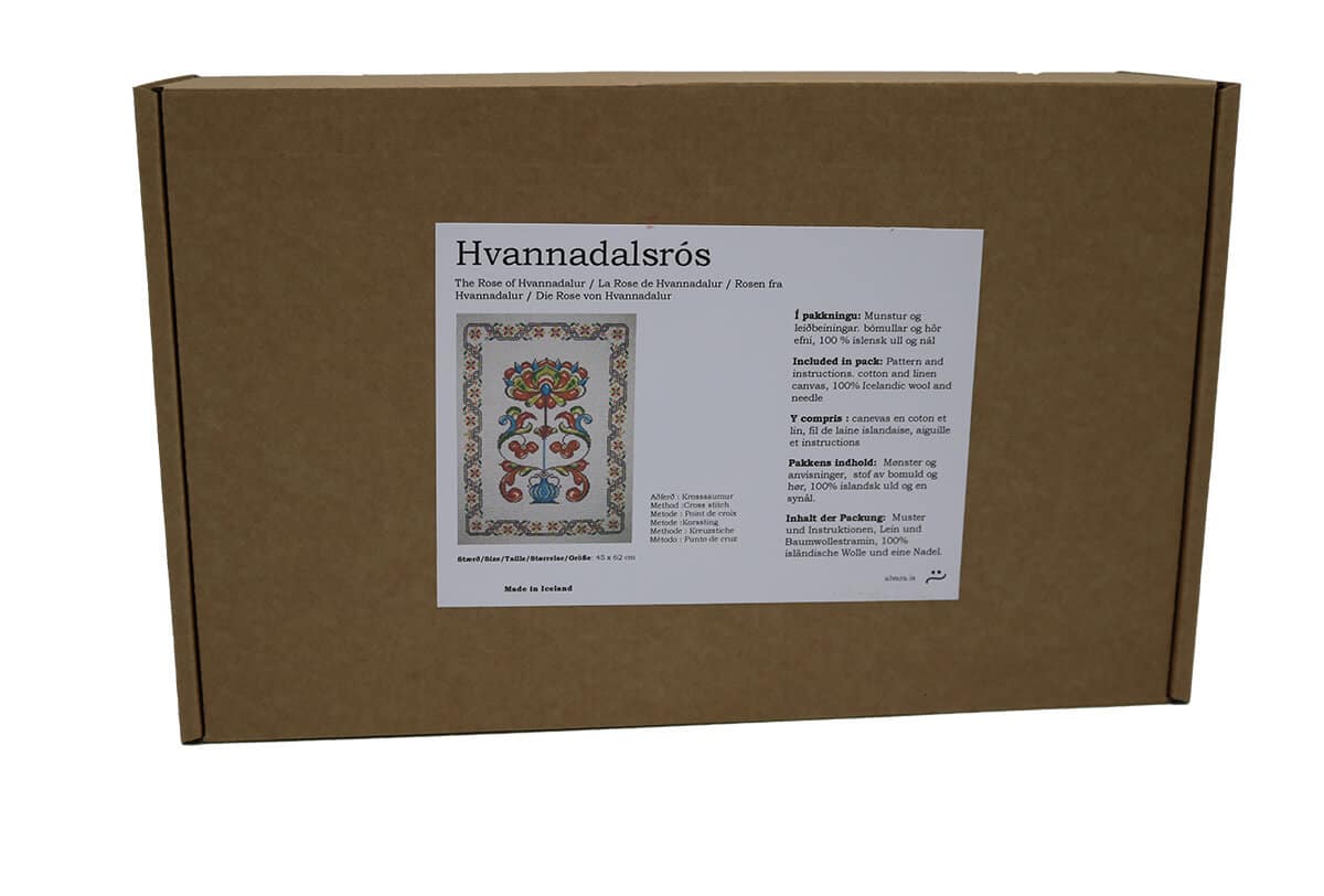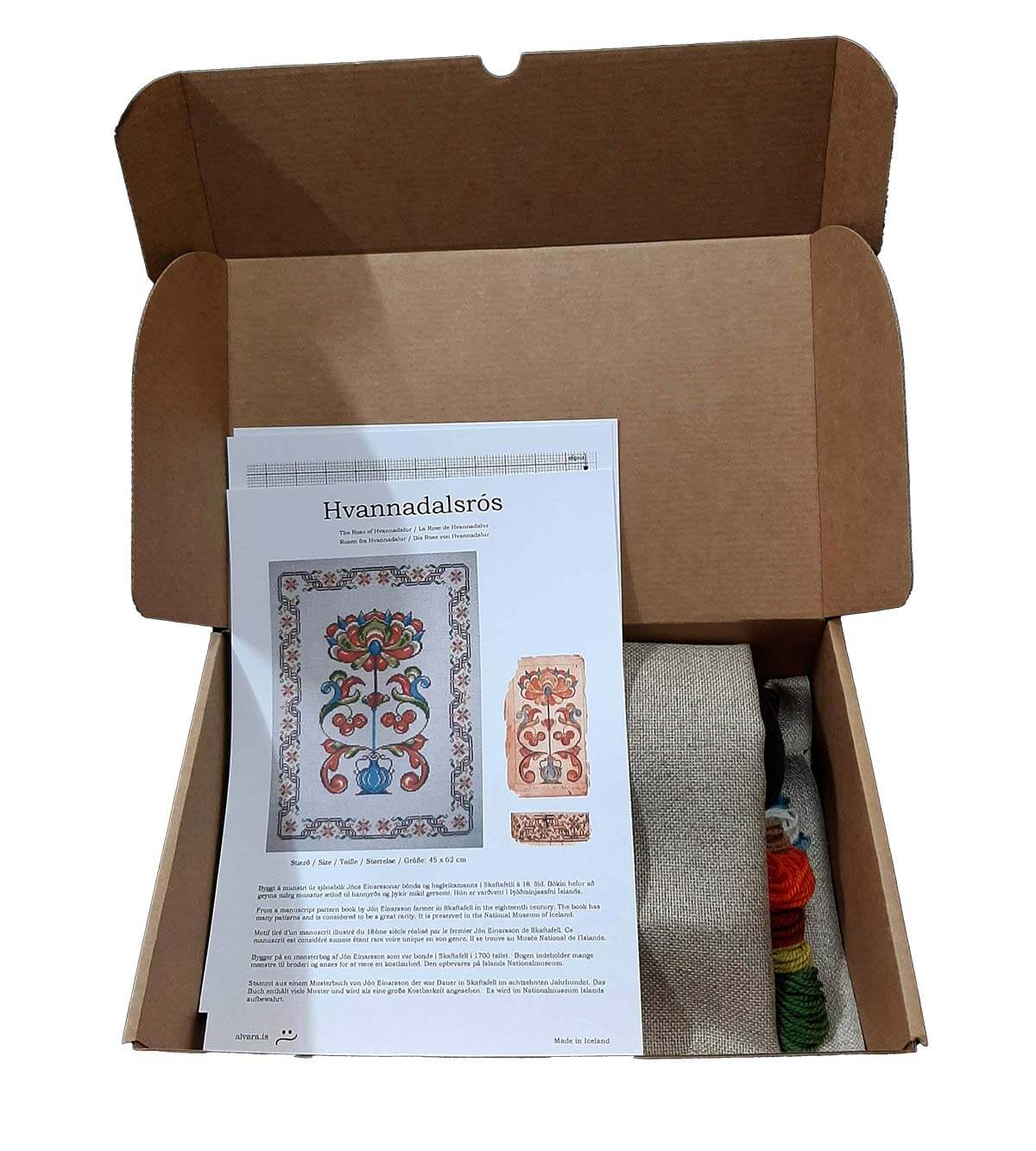 Í pakkanum er mynstur og leiðbeiningar. 100% bómullar og hör strammi, 45×62 cm. 100% íslensk ull og nál.