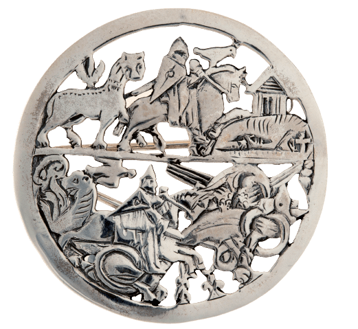Næla gerð eftir efri kringlunni af kirkjuhurð frá Valþjófsstað, frá um 1200.