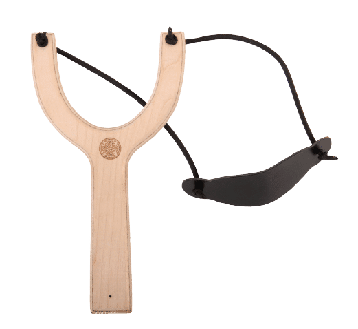 Teygjubyssa úr beykivið, með tíu kúlum úr frauði. Slöngvivaðurinn er úr leðri. Teygjubyssan er 17 cm á hæð.