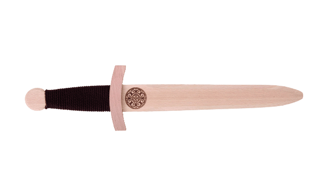 Víkinga tréhnífur 35 cm á lengd. Brúnn bómullarþráður vafin um handfangið til að gera haldið öruggara. Skrautflúr er á hnífsblaðinu sem gerir hnífinn fallegan. Skemmtileg viðbót fyrir litla víkinga.