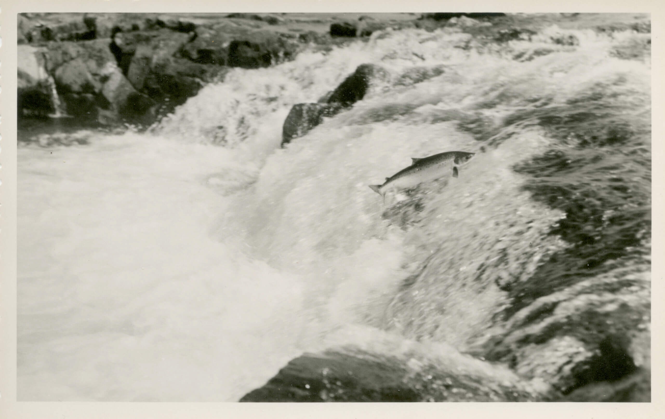 Lax að stökkva upp foss, Glanni Norðurá 1935-1945. Ljósmyndari Björn Magnús Arnórsson 1891-1962.