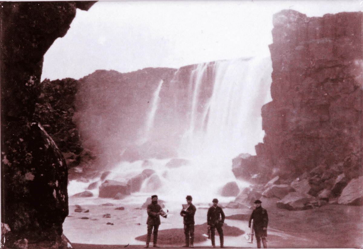 Segull. Lúðraþytur við Öxarárfoss. Mynd af Lúðurþeytarafélag Reykjavíkur að þeyta lúðra við Öxarárfoss, 1885.